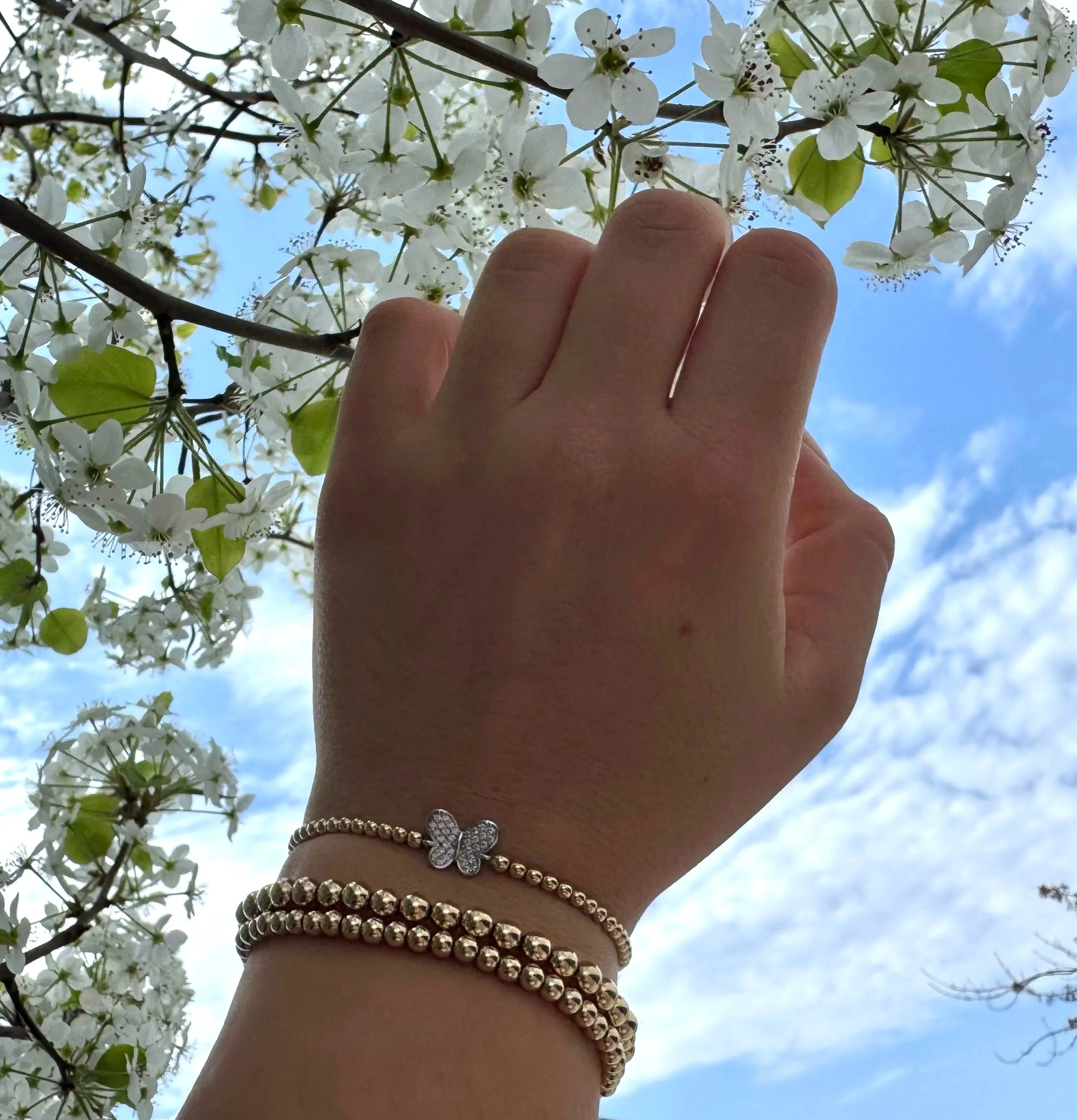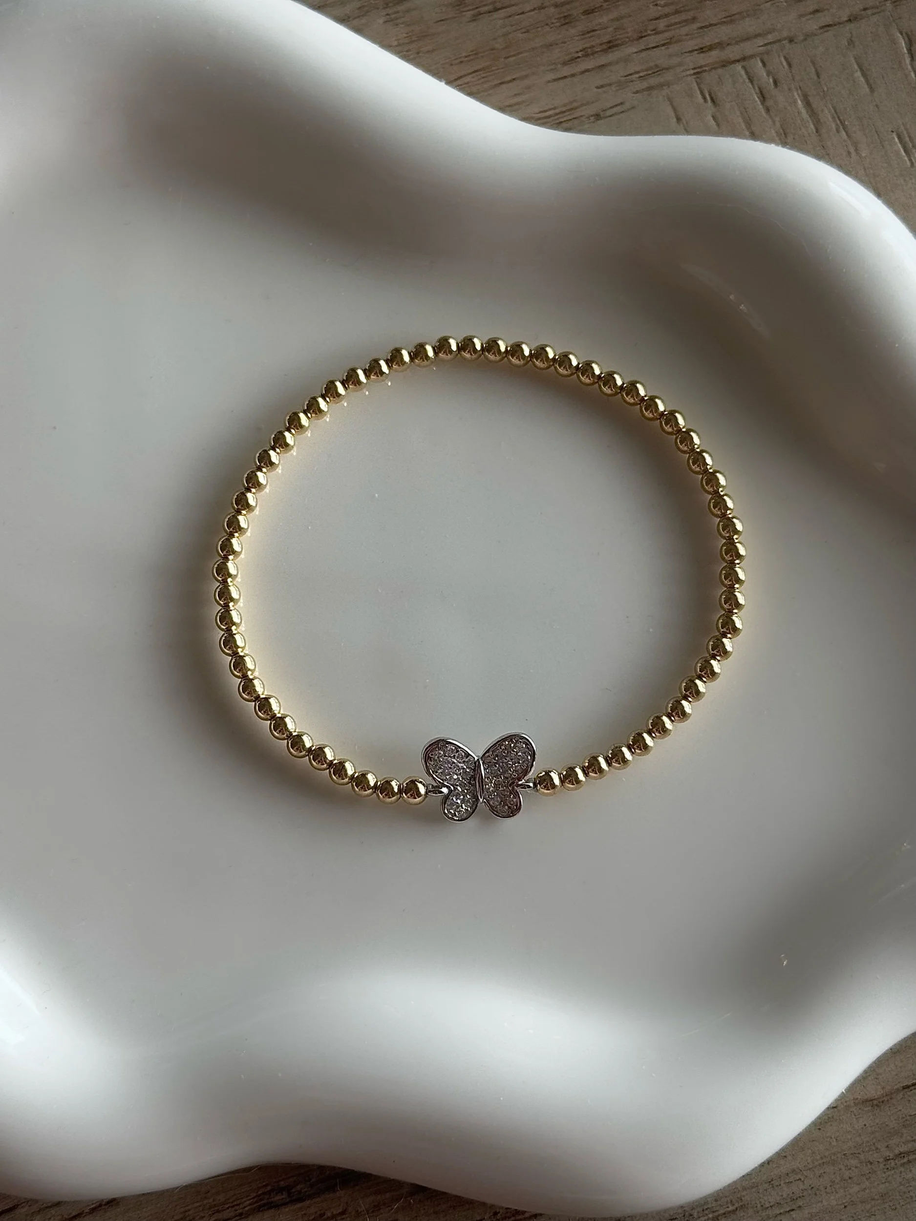 Gold Filled 3mm Beaded Bracelet with Pavé CZ Sterling Silver Butterfly Pendant